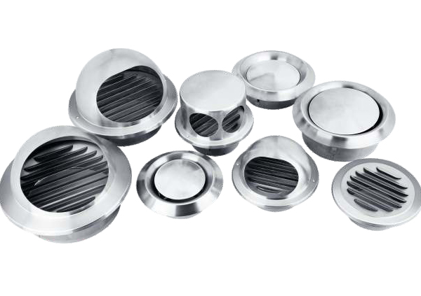 不銹鋼牛鼻型風口,裝有百葉,后部配有合為一體防蚊罩,適合于直徑為100,125,150,160,200,315mm的圓形風管。